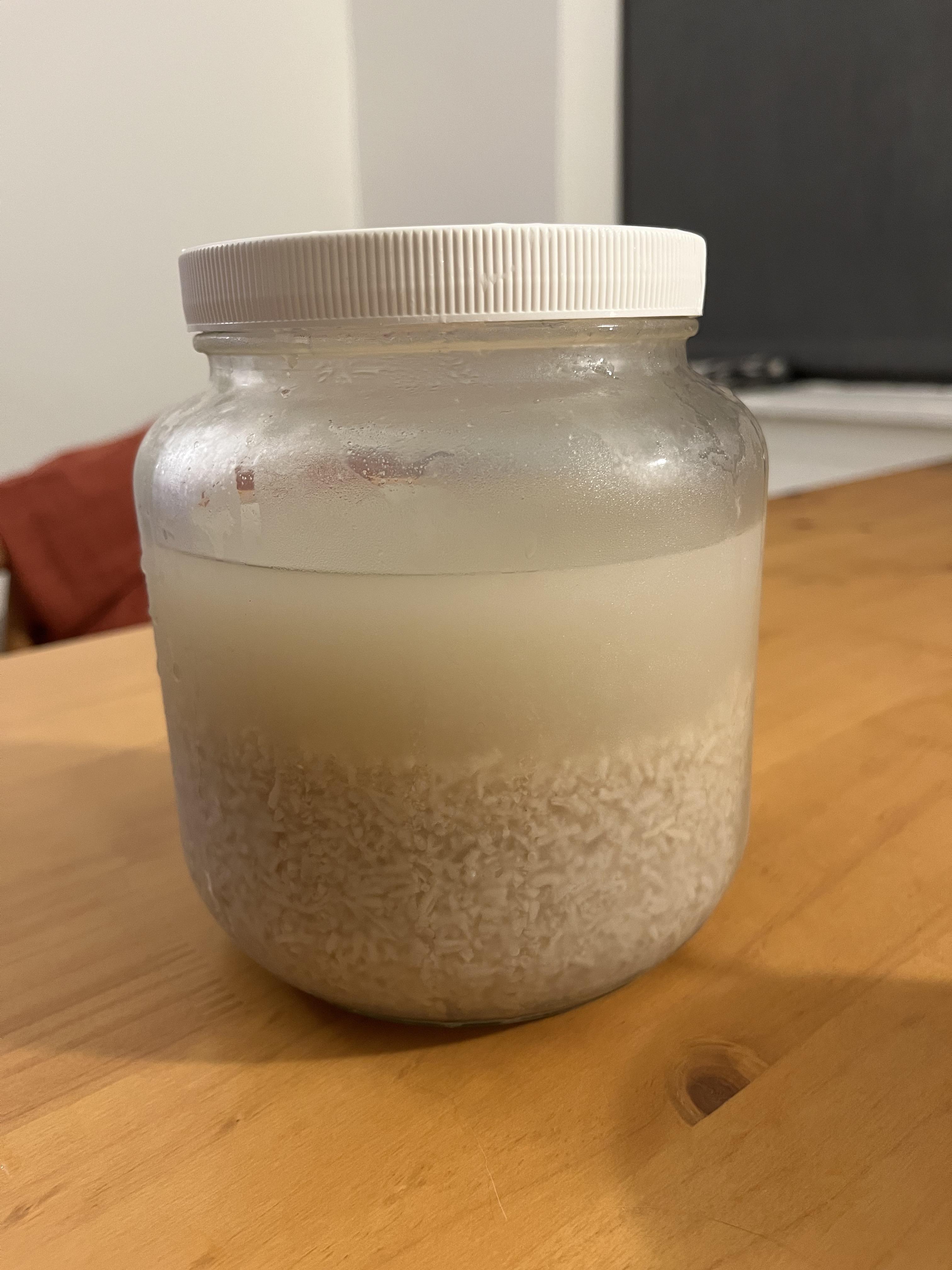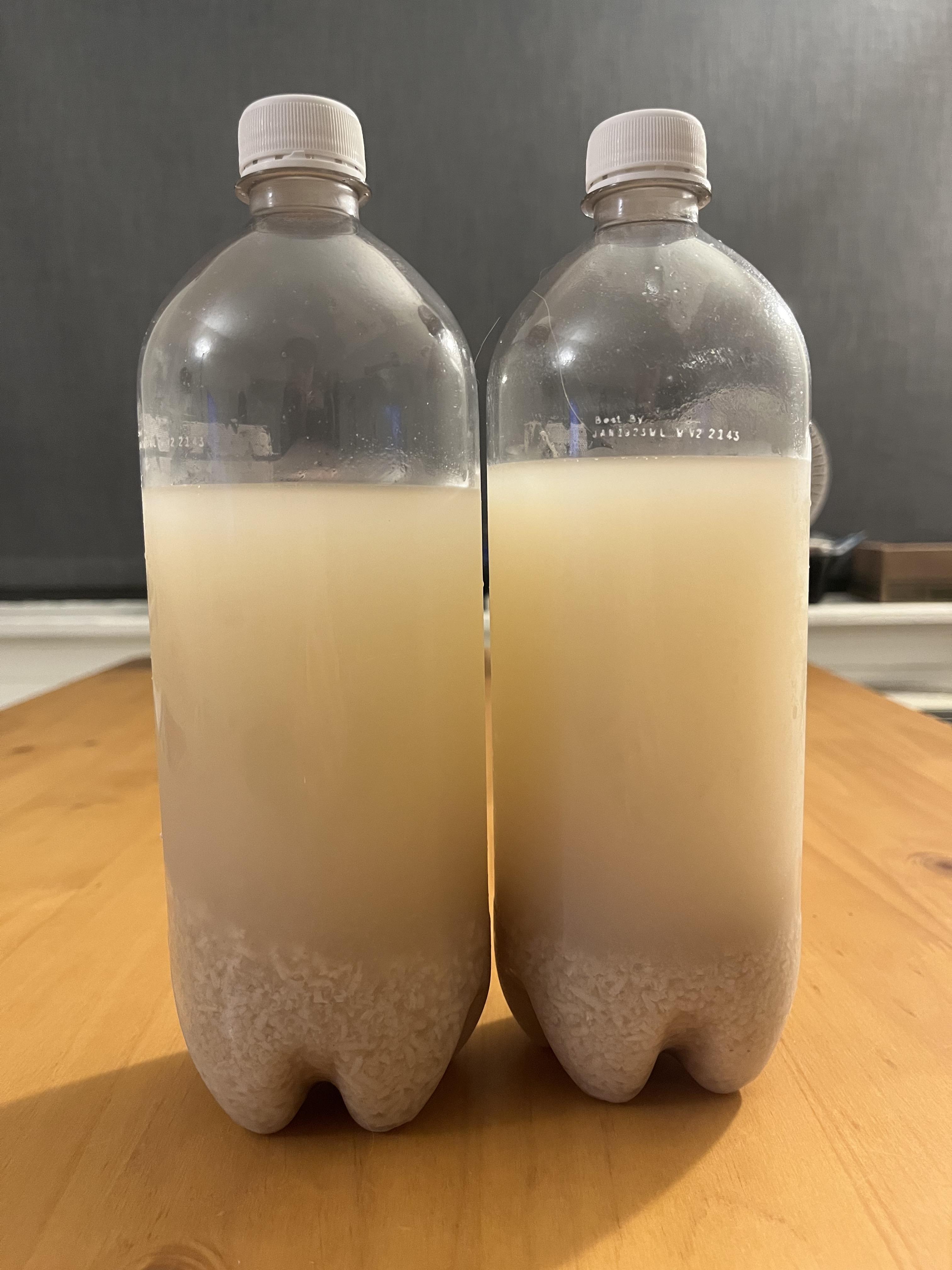 3. 엿기름을 몇 분간 가만히 냅두어 녹말을 가라앉힌 후 미리 해둔 밥에 붓습니다.
